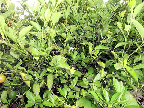 右近の橘 右近の橘 実は橙色に熟れているが白い花が咲いていた